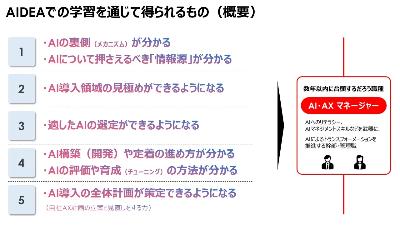 AIDEAでは、AIを人と同様に捉え、組織の中にどのように組み入れれば良いかの実践的な”考え方”と”プロセス”を学べます。